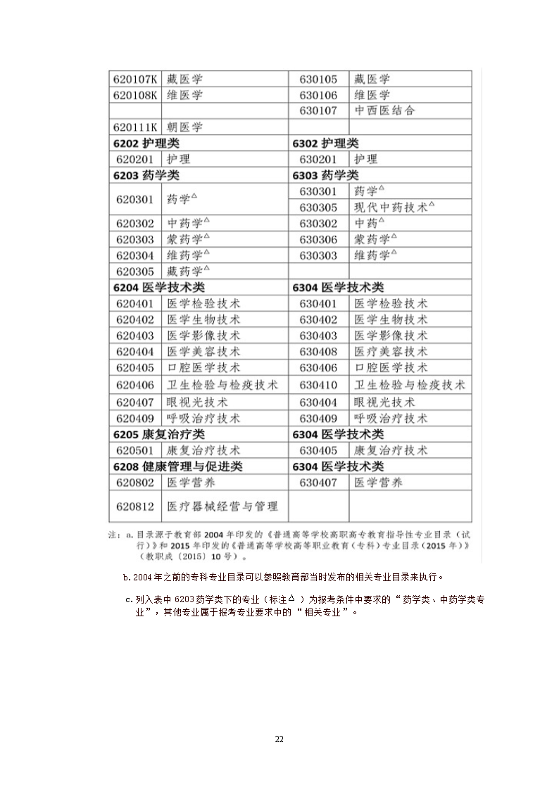 报考条件中要求的“药学类、中药学类专业”,按照国务院学位委员会、教育部印发的《学位授予和人才培养学科目录设置与管理办法》《普通高等学校高等职业教育(专科)专业设置管理办法》和《学位授予和人才培养学科目录》《普通高等学校本科专业目录(2012年)》《普通高等学校高等职业教育(专科)专业目录(2015年)》等规定,对照学科目录来界定。