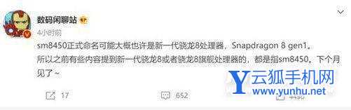 11月15日 高通新一代旗舰移动平台普遍被外界称为骁龙898,代号为sm8450。但据微博博主@数码闲聊站爆料,sm8450的正式命名可能会是“骁龙8 gen1”。