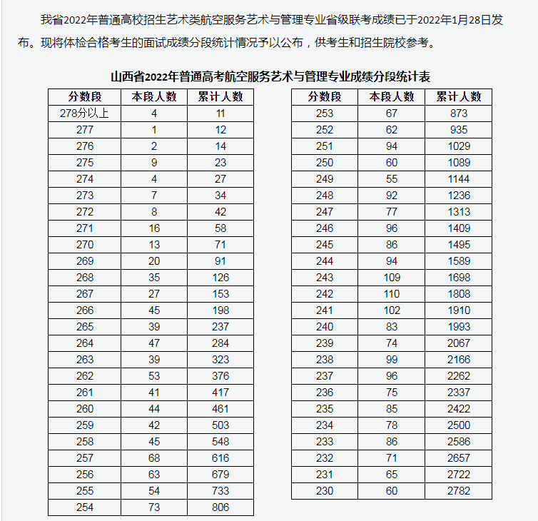 【#艺术高考# 导语】®文档大全网从山西招生考试网了解到,山西省2022年普通高校招生艺术类航空服务艺术与管理专业成绩分段统计情况公布。具体如下: