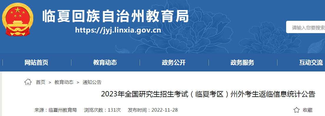 2023年全国研究生招生考试甘肃(临夏考区)州外考生返临信息统计公告11-29