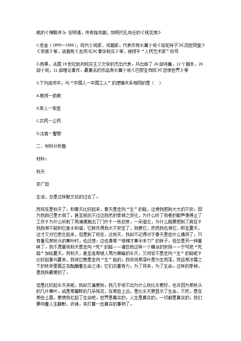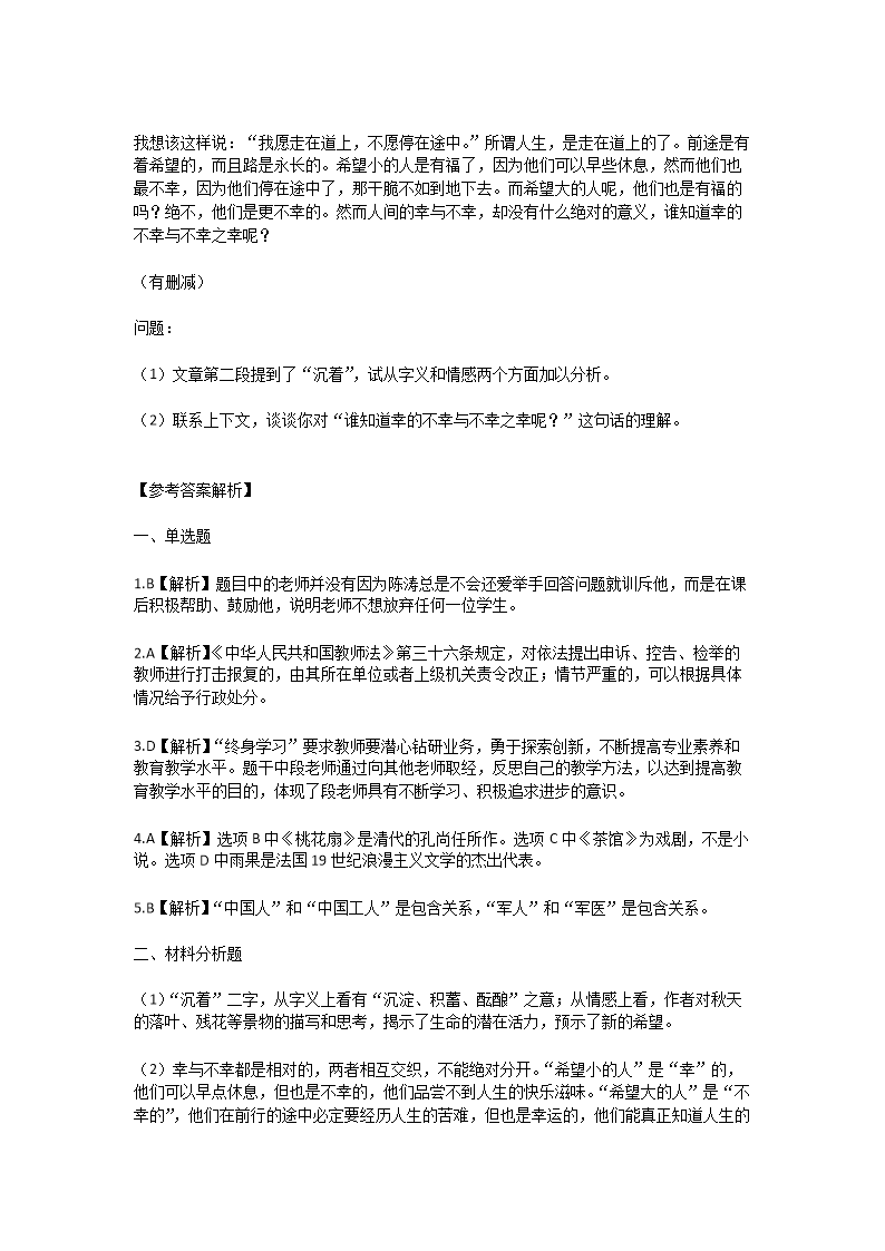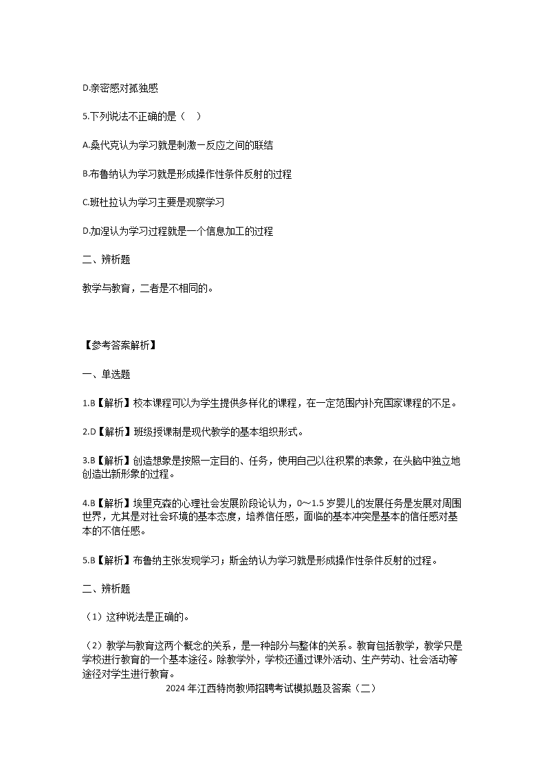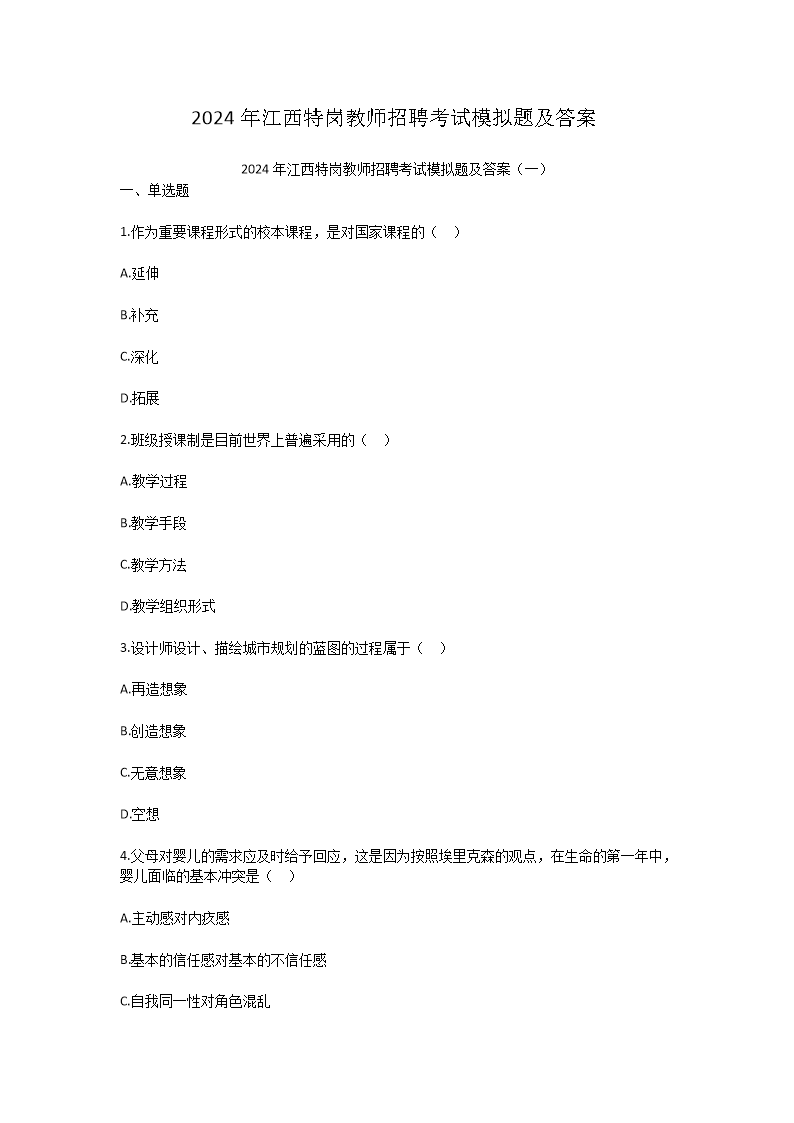 2024年江西特岗教师招聘考试模拟题及答案(Word版)10-20
