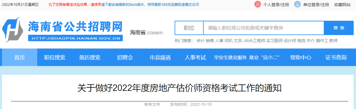 2022年海南房地产估价师报名时间:2022年10月20日至10月24日,报名工作采用网上报名的方式,符合条件的报考人员通过“海南省公共招聘网”在线填写提交报考信息,并按相关规定办理网上缴费手续。