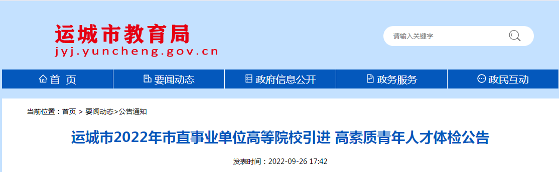 2022年山西省运城市市直事业单位高等院校引进高素质青年人才体检公告09-28