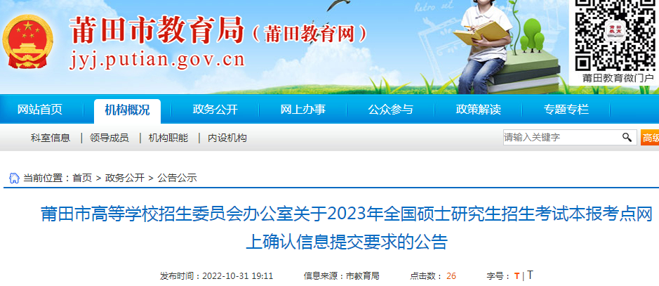 关于2023年全国硕士研究生招生考试福建莆田报考点网上确认信息提交要求的公告11-01