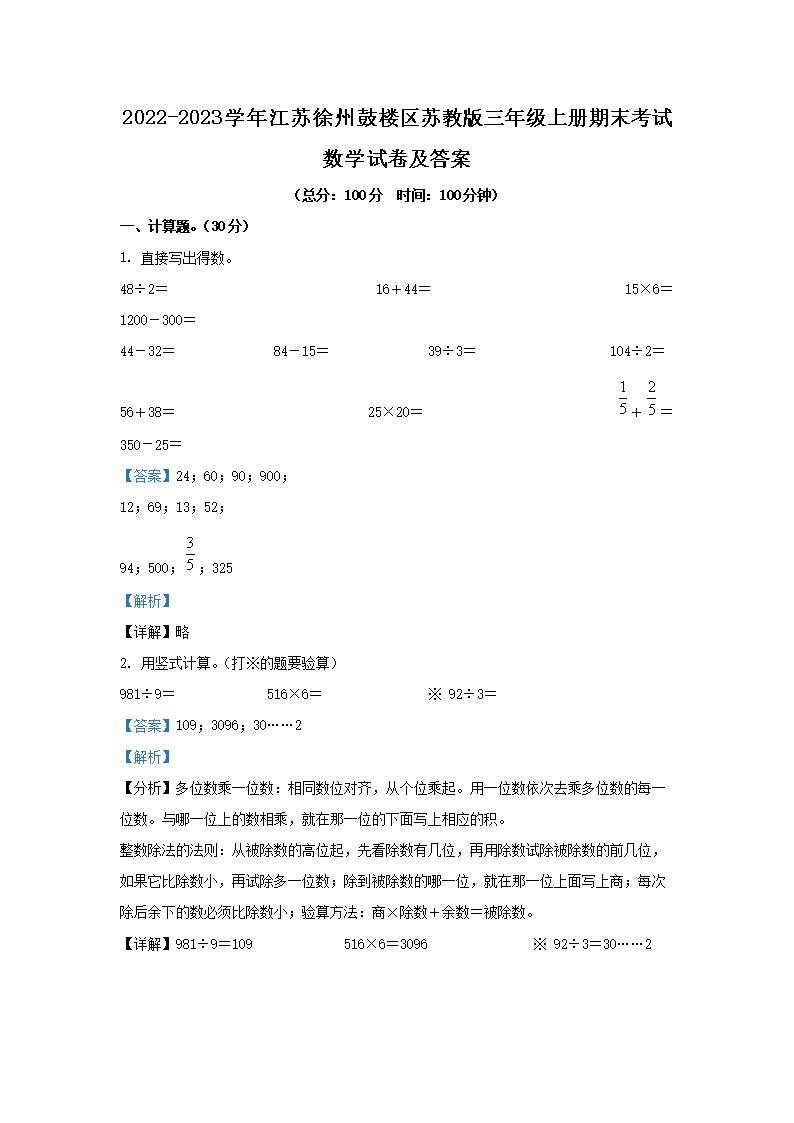 2022-2023学年江苏徐州鼓楼区苏教版三年级上册期末考试数学试卷及答案(Word版)07-15