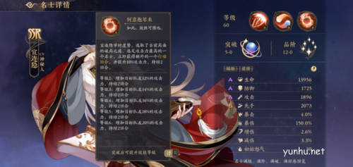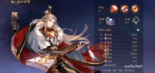 宣连隐的生命、防御、攻击面板是A,先手是S,对得起SSR级的水平。他的被动很特别:如果我方有名士阵亡,就回收这个阵亡名士的50%的怒气分配给除了自己之外的剩下的队友,2级被动是我方有名士阵亡,会给宣连隐加20点怒气。