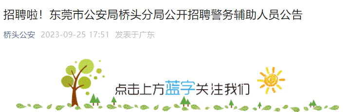 【#招警考试# #2023年广东东莞市公安局桥头分局招聘警务辅助人员41名公告(9月25日-10月5日)#】®文档大全网从桥头公安公众号获悉,2023年广东东莞市公安局桥头分局招聘警务辅助人员41名。报名时间:9月25日-10月5日,更多事宜请参考阅读《招聘公告》,官方公告原文如下: