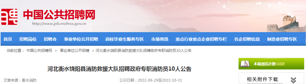 【#事业单位# 导语】2022年河北省衡水市饶阳县消防救援大队政府专职消防员招聘公告【10人】已发布。®文档大全网现将招聘公告原文发布如下: