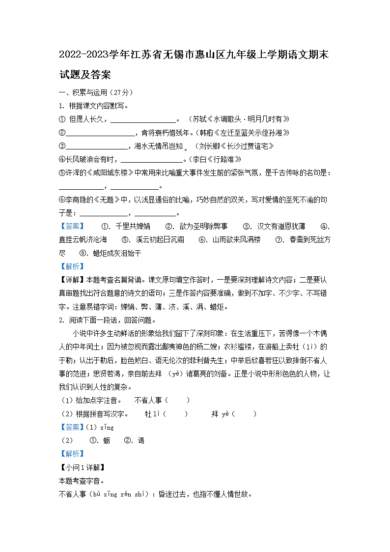 2022-2023学年江苏省无锡市惠山区九年级上学期语文期末试题及答案(Word版)09-09