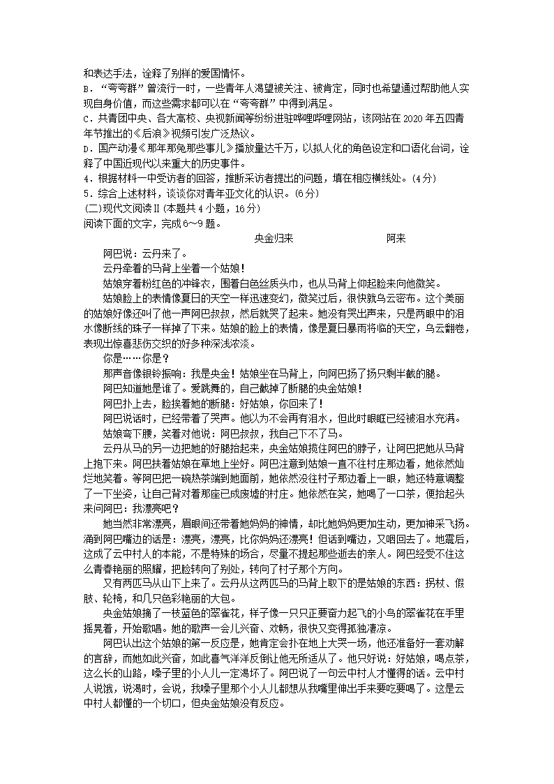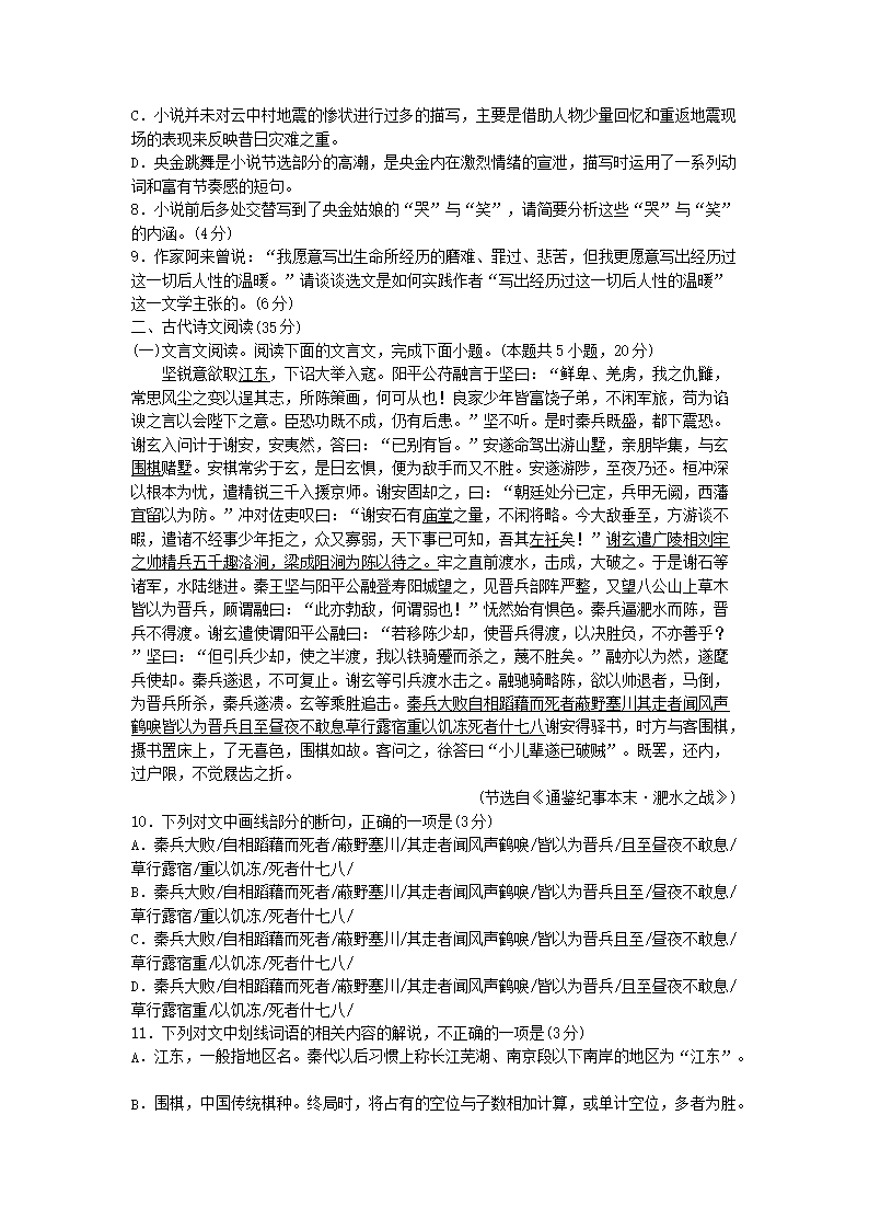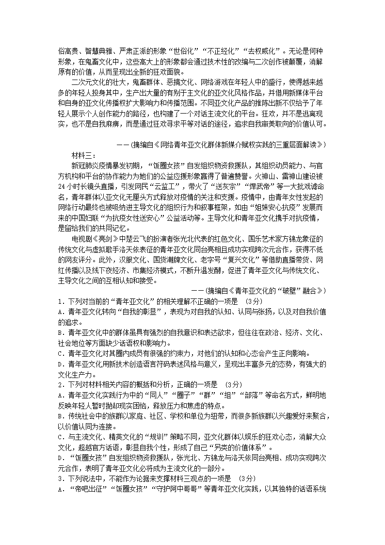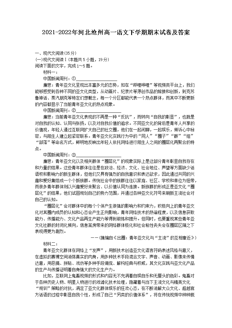 2021-2022年河北沧州高一语文下学期期末试卷及答案(Word版)07-29