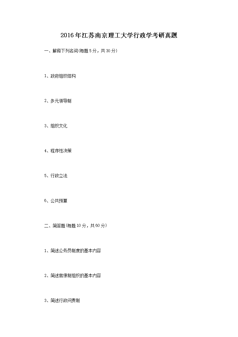 【文档预览】 文档大全网整理发布2016年江苏南京理工大学行政学考研真题(Word版),前五页预览如下: