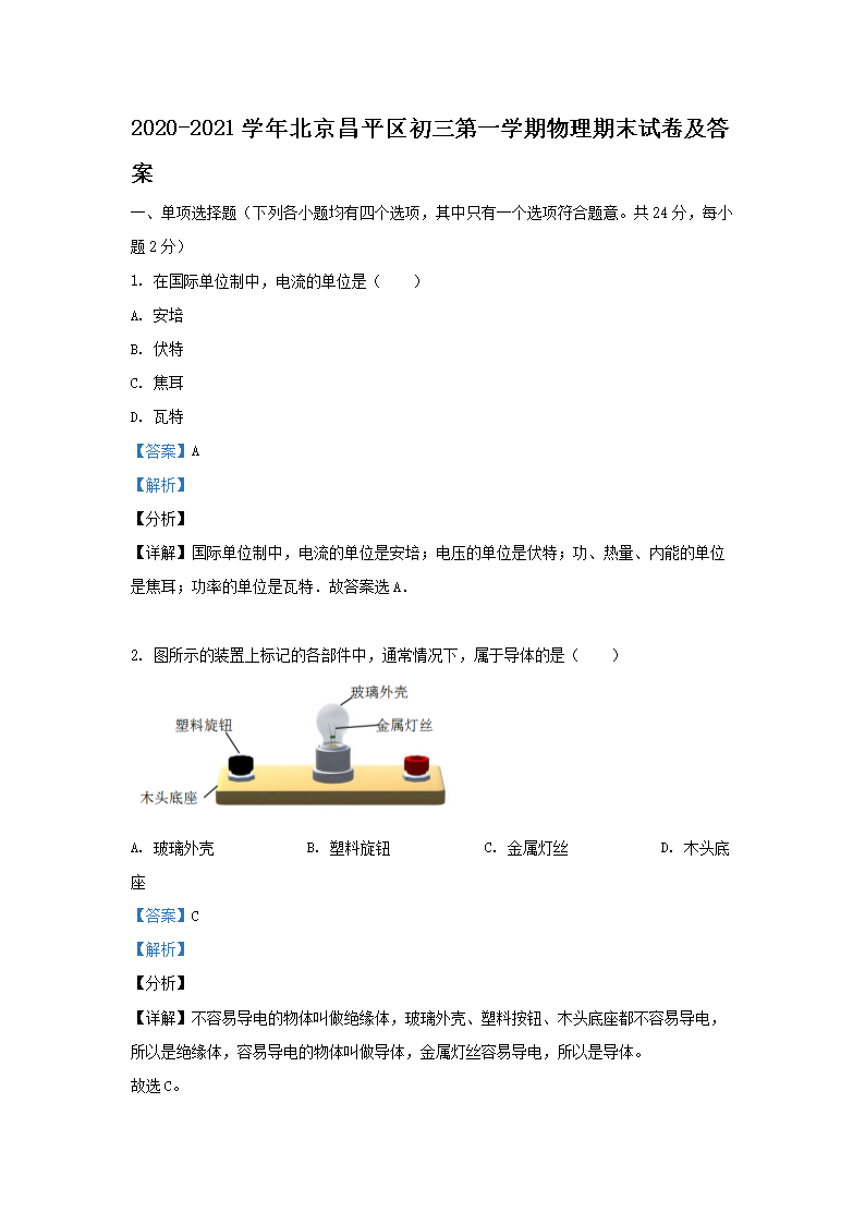 2020-2021学年北京昌平区初三第一学期物理期末试卷及答案(Word版)07-22