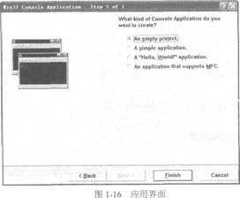 (5)选择A“Hello,World!”application选项,根据使用Visual C++完成任务的不同可以选不同的选项,单击“Finish”接着进入以下界面(如图1-17)。