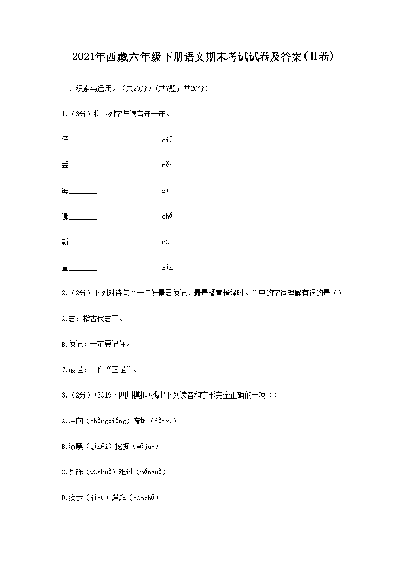【文档预览】 文档大全网整理发布2021年西藏六年级下册语文期末考试试卷及答案(Ⅱ卷)(Word版),前五页预览如下: