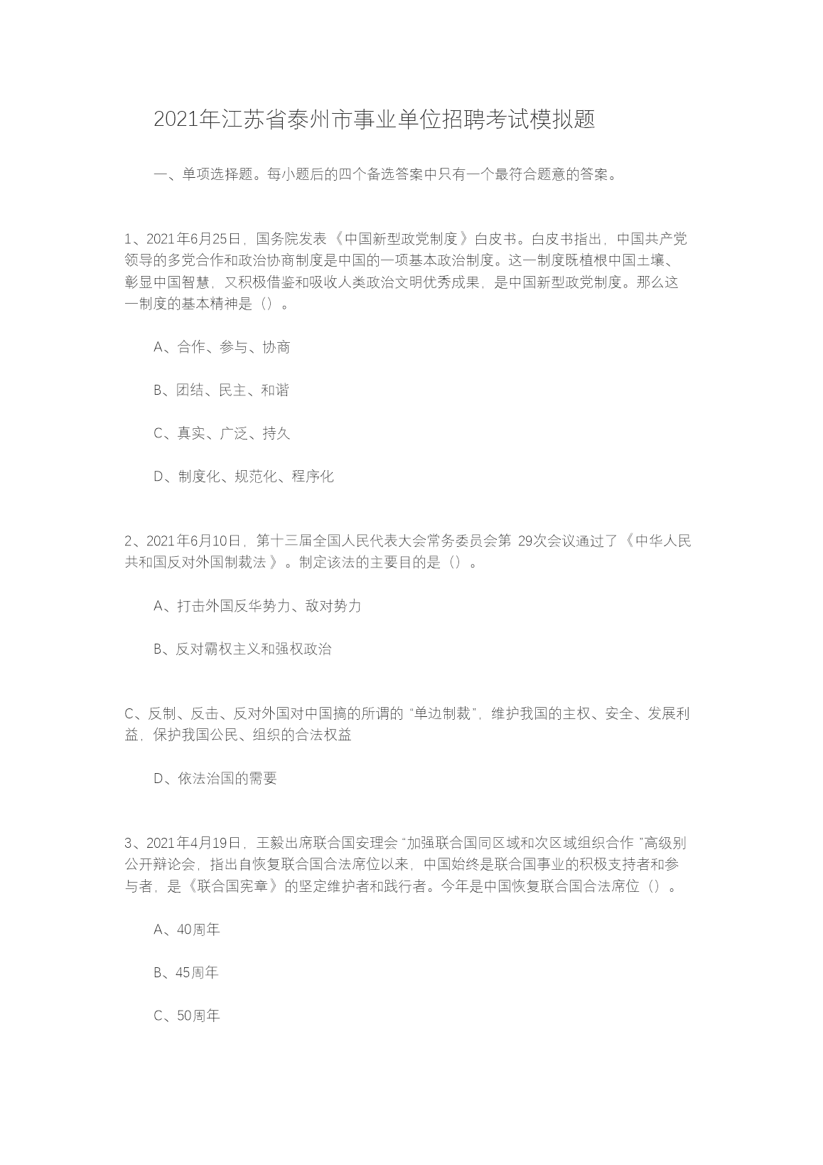 2021年江苏省泰州市事业单位招聘考试模拟题(Word版)10-19