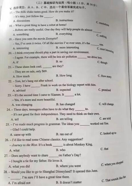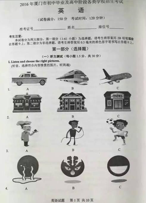 2016福建厦门中考英语试题(已公布)04-13