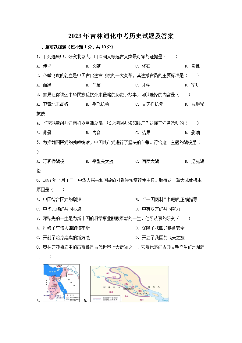 【文档预览】 文档大全网整理发布2023年吉林通化中考历史试题及答案(Word版),前五页预览如下: