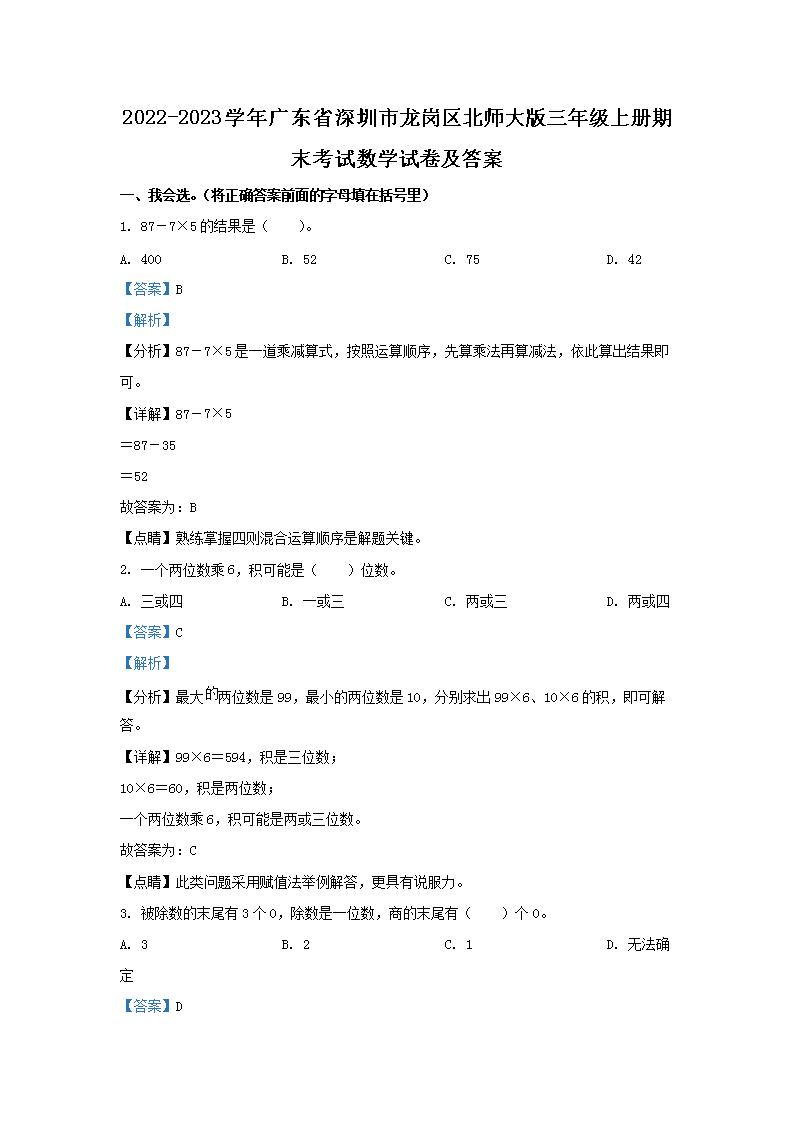 2022-2023学年广东省深圳市龙岗区北师大版三年级上册期末考试数学试卷及答案(Word版)08-11
