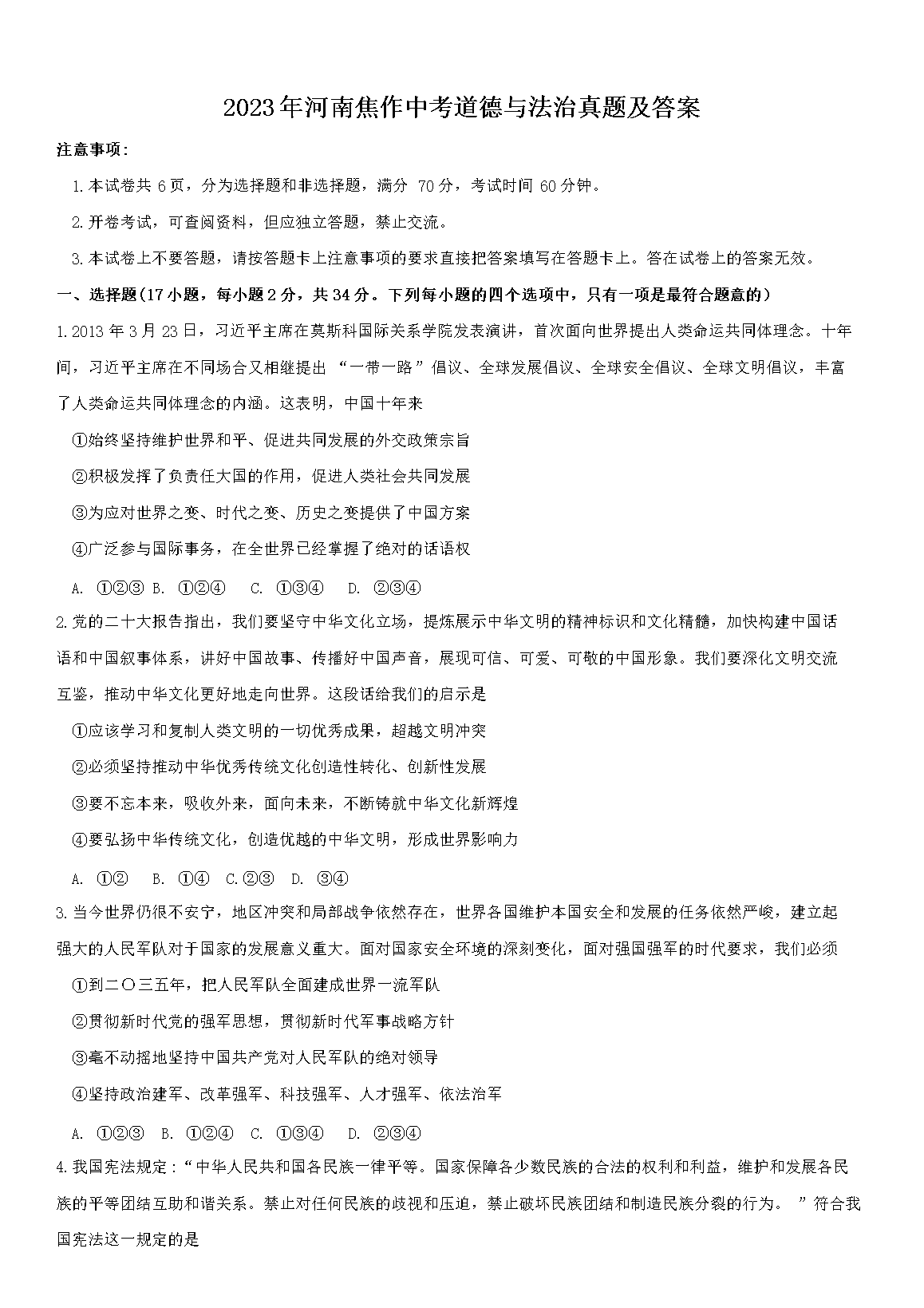 【文档预览】 文档大全网整理发布2023年河南焦作中考道德与法治真题及答案(Word版),前五页预览如下: