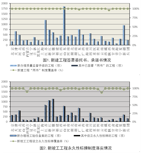 从各地上报情况看,仍有部分地区工程质量终身责任制落实效果较差。其中,陕西、广东、山东、新疆等4个省(区)法定代表人授权书、工程质量终身责任书签署率未达到100%,云南、内蒙古、江西、新疆、广东、贵州、江苏 7个省(区)永久性标牌覆盖率低于全国平均水平,部分地区监督执法检查力度不够,重检查、轻处罚现象仍然突出。