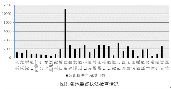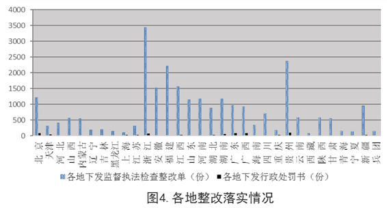 各地共下发监督执法检查整改单25894份、行政处罚书934份,处罚相关单位696个,处罚相关人员297名,实施信用惩戒651起,曝光违法违规典型案例169起。从行政处罚数量看,贵州、北京、广东3个省(市)处罚力度较大;从曝光典型案例数量看,湖南、重庆、海南 3个省(市)曝光力度较大。
