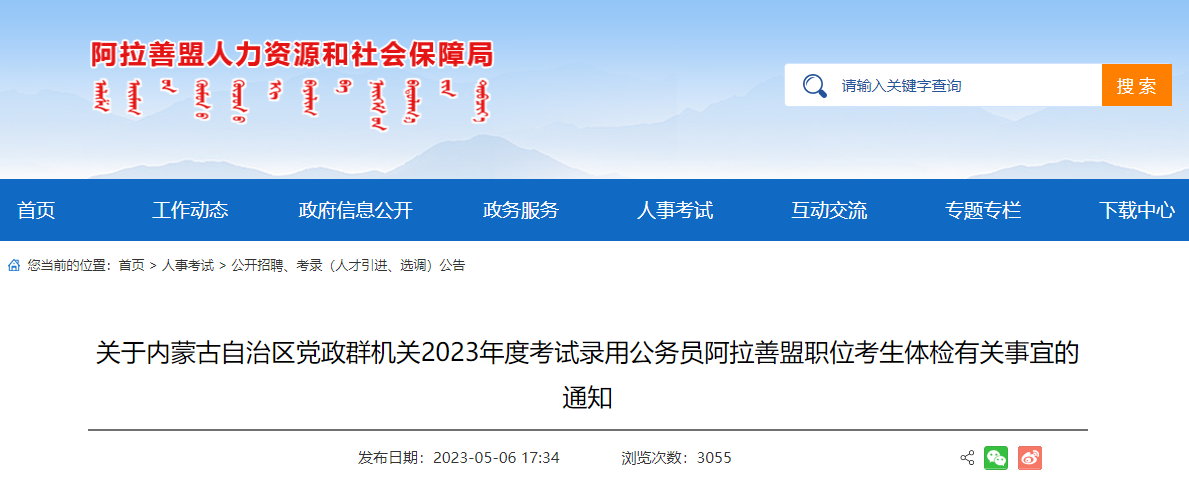 原文标题:关于内蒙古自治区党政群机关2023年度考试录用公务员阿拉善盟职位考生体检有关事宜的通知
