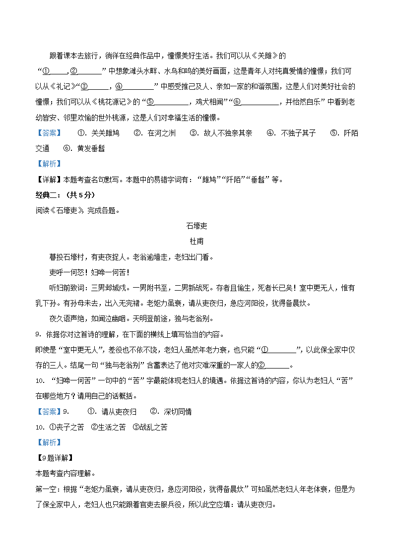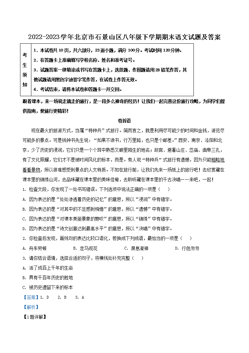 2022-2023学年北京市石景山区八年级下学期期末语文试题及答案(Word版)09-27