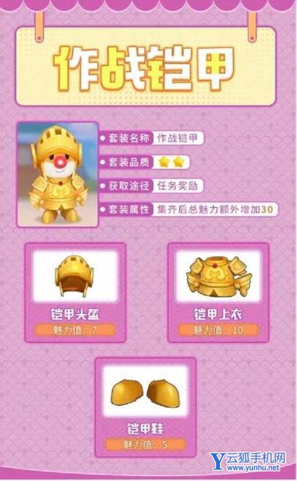 作战铠甲一共有3个部件,分别是铠甲头盔、铠甲上衣、铠甲鞋,魅力加成值分别为7/10/5。基础魅力值相加为22点。另外,当玩家集齐该套装的全部部件后,总魅力值会额外提高30点。套装通体金色,看起来还是比较炫酷的,属性上也说得过去。