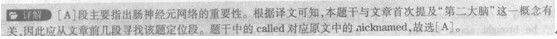 [F] The second brain informs our state of mind in other more obscure ways, as well. "A big part of our emotions are probably influenced by the nerves in our gut," Mayer says. Butterflies in the stomach-signaling in the gut as part of our physiological stress response, Gershon says--is but one example. Although gastrointestinal (肠胃)(GI)chaos can sour one's moods, everyday emotional well-being may rely on messages from the brain below to the brain above. For example, electrical stimulation of the vagus nerve-a useful treatment for depression-may mimic these signals, Gershon says.