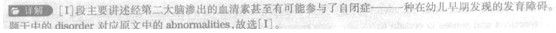 [I] Serotonin penetrating from the second brain might even play some part in autism (孤独症), the developmental disorder often first noticed in early childhood. Gershon has discovered that the same genes involved in synapse formation (突触形成)between neurons in the brain are involved in the digestive synapse formation. "of these genes are affected in autism," he says, "it could explain why so many kids with autism have GI motor abnormalities in addition to elevated levels of gut-produced serotonin in their blood. "