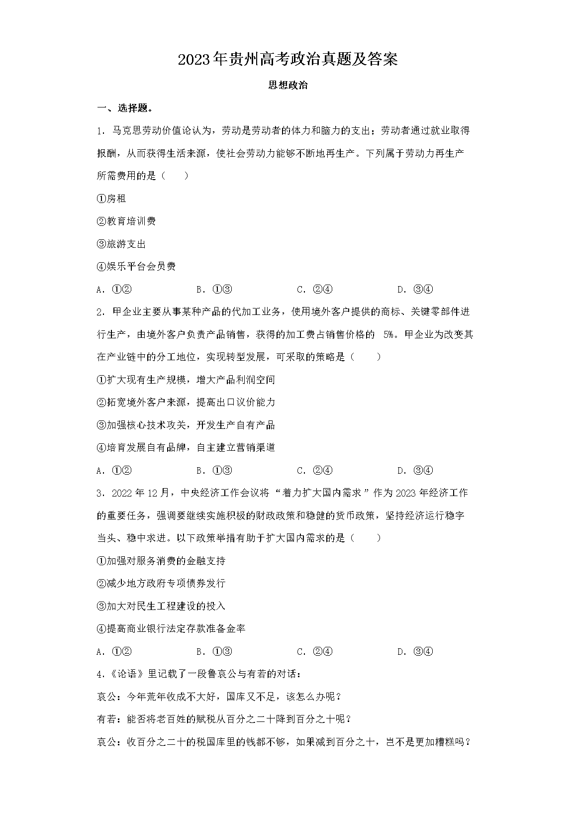 【文档预览】 文档大全网整理发布2023年贵州高考政治真题及答案(Word版),前五页预览如下: