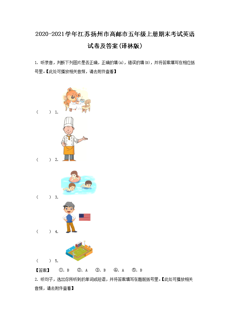 2020-2021学年江苏扬州市高邮市五年级上册期末考试英语试卷及答案(译林版)(Word版)09-14
