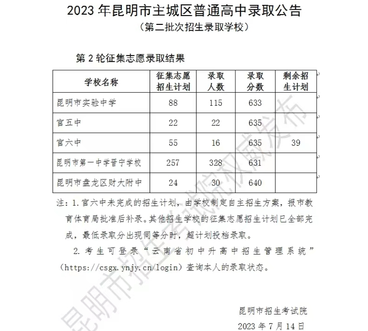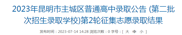 2023年云南昆明主城区普通高中(第二批次招生录取学校)第2轮征集志愿录取结果公布07-15