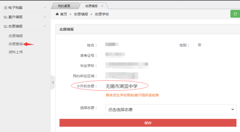 4.选择志愿填报,志愿选择“无锡市湖滨中学”,并点击“保存”按钮保存志愿。