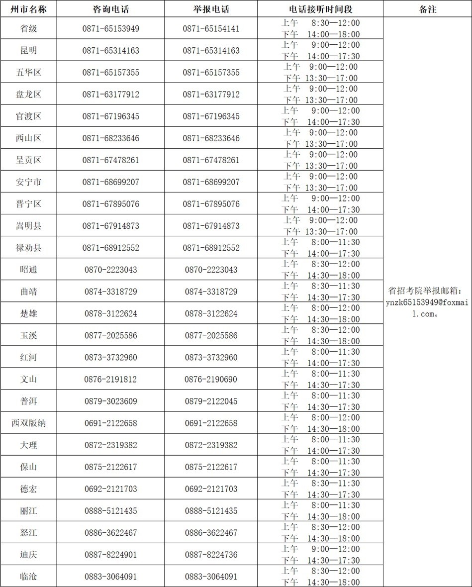 2023年4月云南省第89次高等教育自学考试咨询及举报电话04-08
