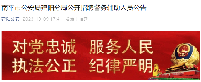 【#招警考试# #2023年福建南平市公安局建阳分局招聘警务辅助人员公告(4人)#】®文档大全网从建阳公安了解到,2023年福建南平市公安局建阳分局招聘警务辅助人员4人,相关事宜详情如下: