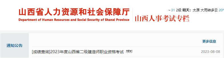 2023年山西二级建造师考试成绩查询时间:8月8日起,报考人员通过“山西省人力资源和社会保障厅(rst.shanxi.gov.cn)”查询考试成绩!