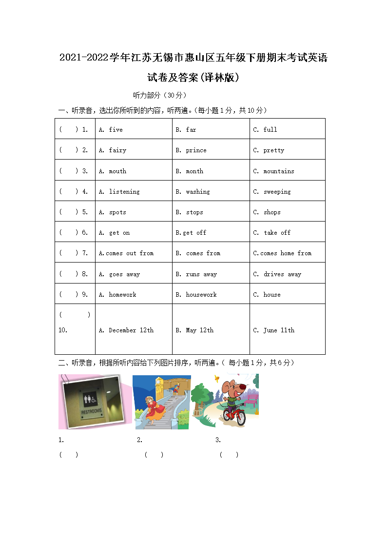 2021-2022学年江苏无锡市惠山区五年级下册期末考试英语试卷及答案(译林版)(Word版)09-23