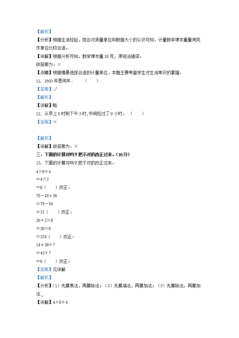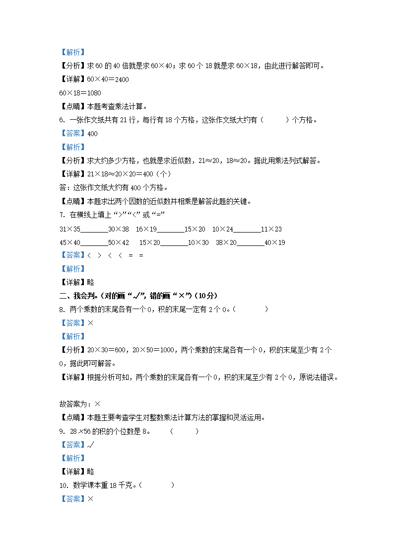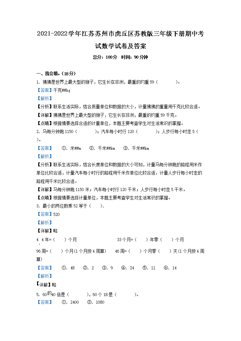 2021-2022学年江苏苏州市虎丘区苏教版三年级下册期中考试数学试卷及答案(Word版)07-08