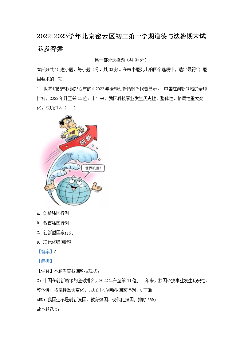 【文档预览】 文档大全网整理发布2022-2023学年北京密云区初三第一学期道德与法治期末试卷及答案(Word版),前五页预览如下: