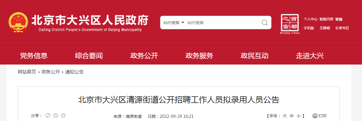 2022年北京市大兴区清源街道公开招聘工作人员拟录用人员公示10-01