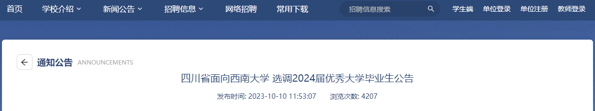 为深入贯彻党的二十大和省委十二届二次、三次全会精神,着力培养造就高素质专业化干部队伍,根据中央组织部《关于进一步加强和改进选调生工作的意见》(组通字〔2018〕17号)、省委组织部《关于进一步加强和改进选调生工作的实施意见》(川组通〔2018〕54号)要求,现就面向西南大学选调2024届应届优秀大学毕业生有关事项公告如下。