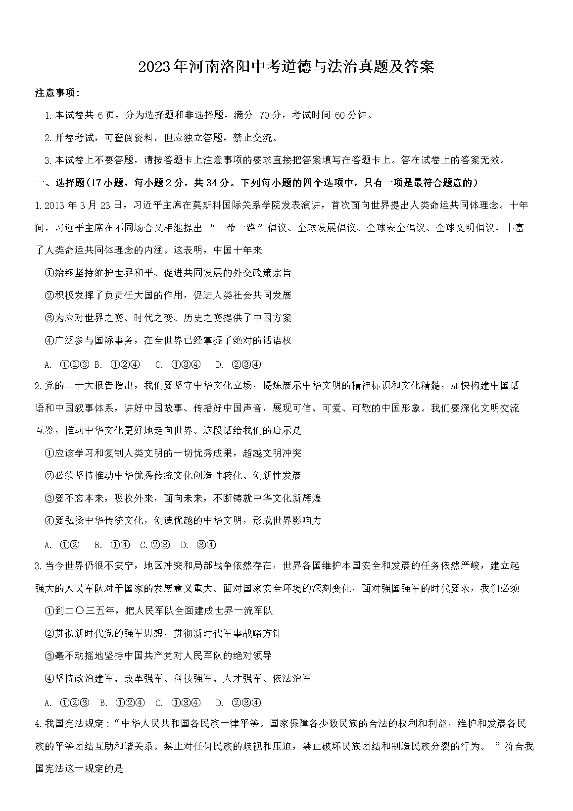 【文档预览】 文档大全网整理发布2023年河南洛阳中考道德与法治真题及答案(Word版),前五页预览如下: