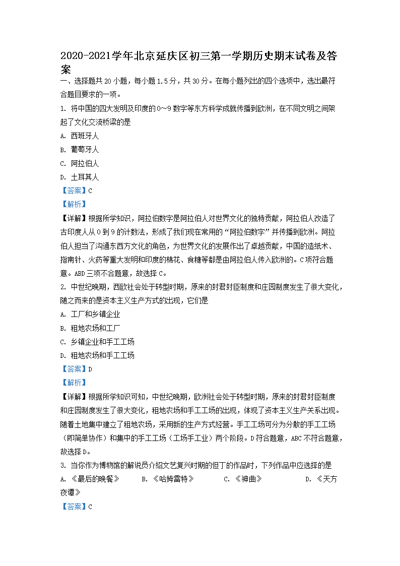 【文档预览】 文档大全网整理发布2020-2021学年北京延庆区初三第一学期历史期末试卷及答案(Word版),前五页预览如下: