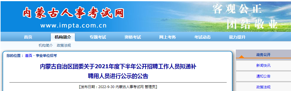 2021年度下半年内蒙古自治区团委关于公开招聘工作人员拟递补聘用人员进行公示的公告10-01