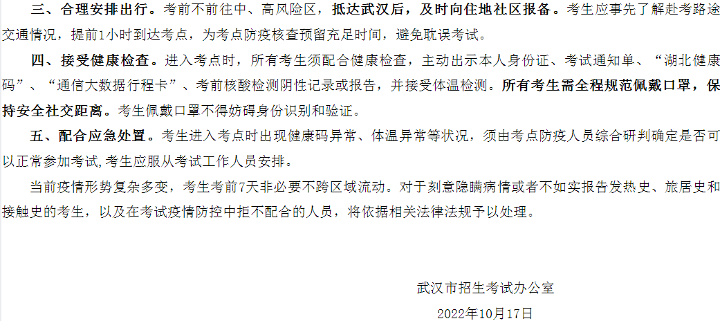 【#自考# 导语】®文档大全网自考频道从武汉市招生考试办公室了解到,湖北武汉2022年10月自学考试疫情防控考生须知已发布,详情如下: