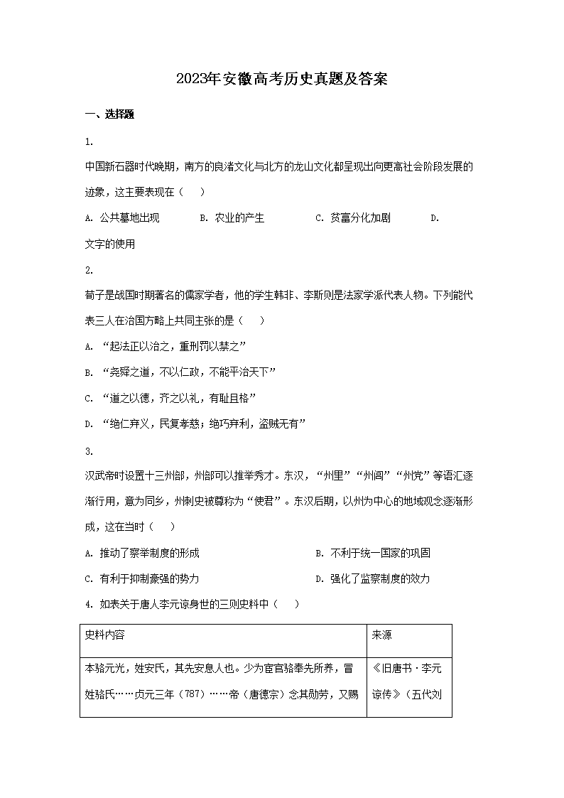 2023年安徽高考历史真题及答案(Word版)06-13
