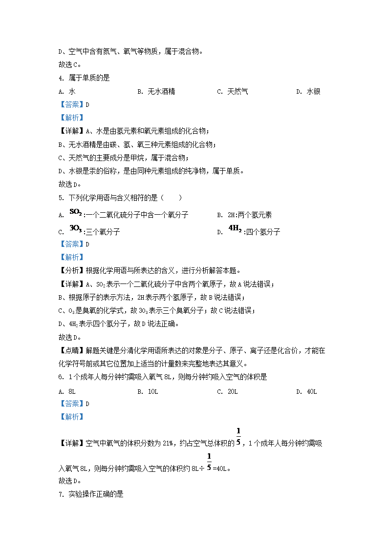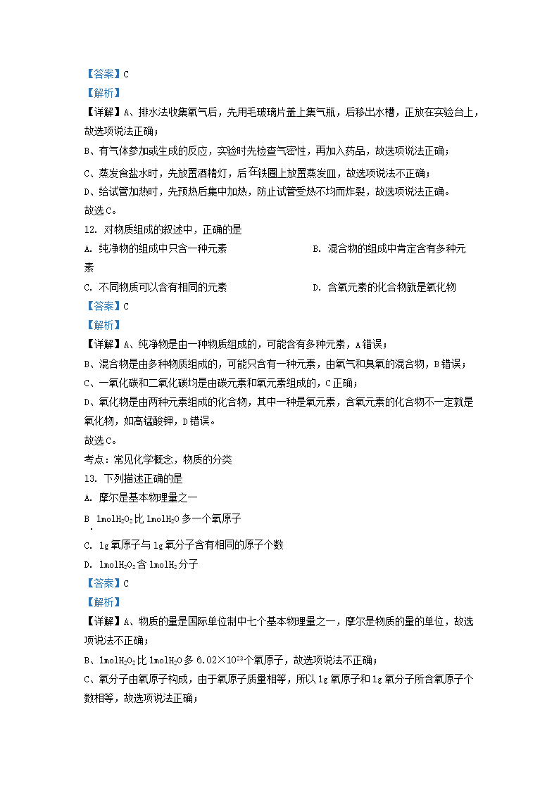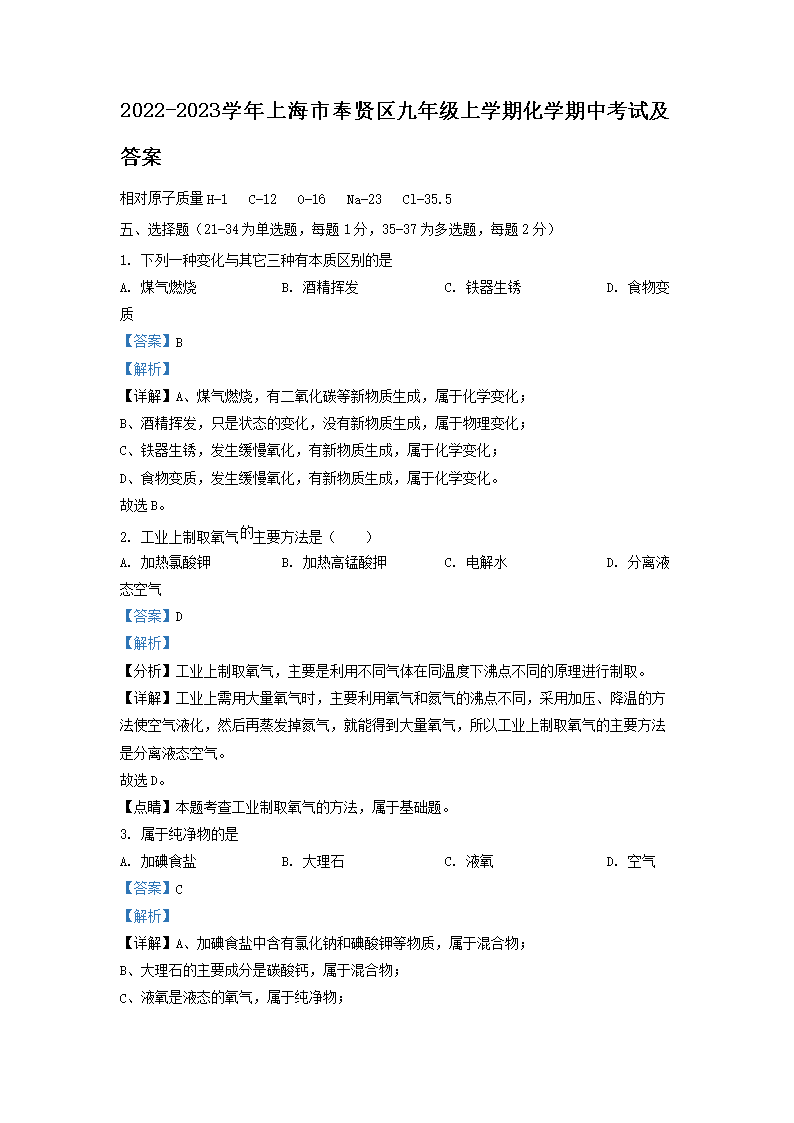 2022-2023学年上海市奉贤区九年级上学期化学期中考试及答案(Word版)10-19