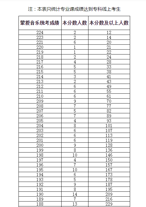 2022年内蒙古自治区普通高校招生考试各分数段人数统计表-蒙授音乐(蒙授音乐统考成绩)12-25