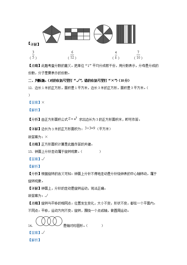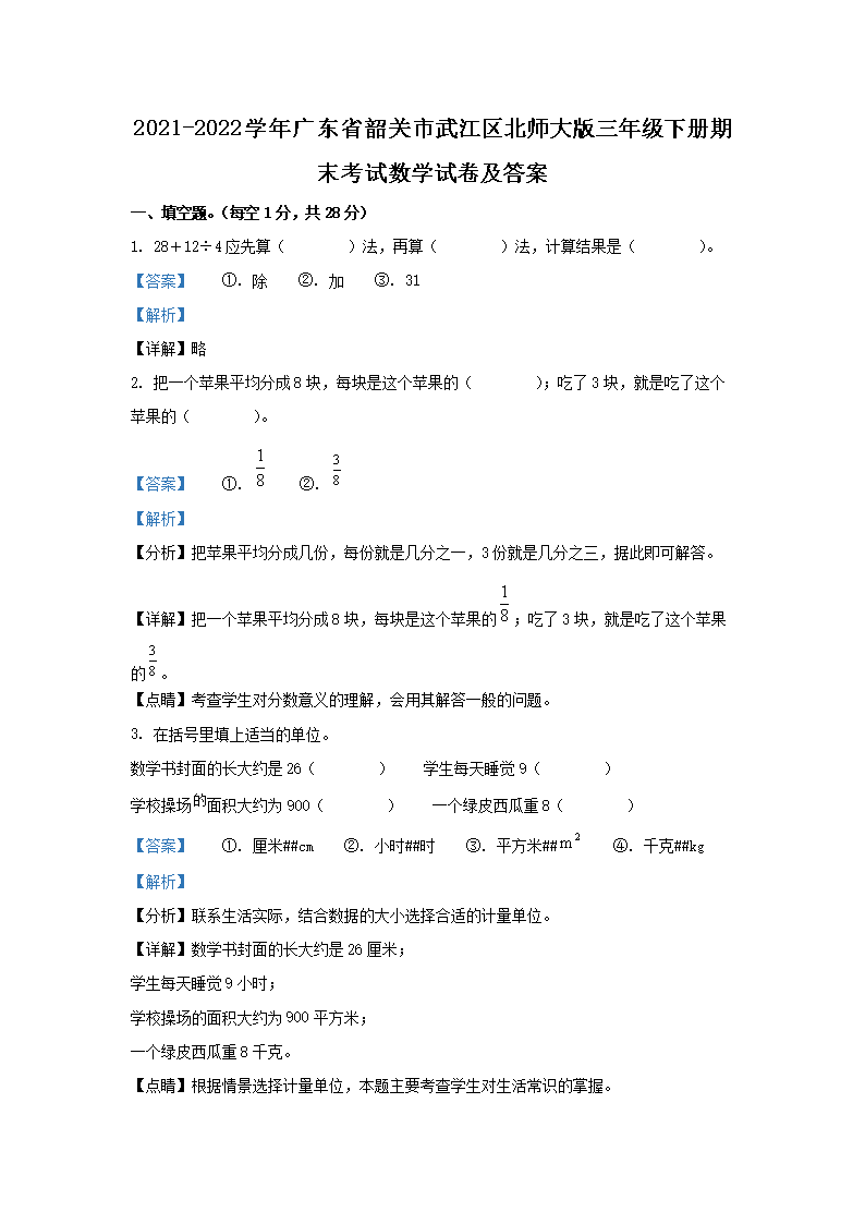 2021-2022学年广东省韶关市武江区北师大版三年级下册期末考试数学试卷及答案(Word版)08-30